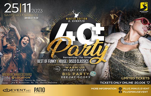 ⬛◼️◾▪️𝟰𝟬 + – 𝗣𝗔𝗥𝗧𝗬▪️◾◼️⬛ 🚷 🅝🅞 🅔🅝🅣🅡🅨 🅤🅝🅓🅔🅡 ➌➎ 🅨🅔🅐🅡🅢 🚷 ▬▬▬ Sa. 25.11.2023 ▬▬▬▬▬▬ Start: 19.00 ▬▬▬ 📍❏❏ HOTEL FOURPOINTS BY SHERATON📍❏❏Via B.Buozzi / B. Buozzistr. Nr. 35 Bolzano/Bozen 🎧 Music by: ✷✷✷✷ 𝔻𝔼𝔼𝕁𝔸𝕐 ℙ𝔸𝕋𝔼𝕏 (WARM UP) ✷✷✷✷ from: Radio S1, Treindlerhof, Apres Club, Stegfete, Castello Club, Piz Boe, Coco Beach, Sesto Senso; ✷✷✷✷ […]