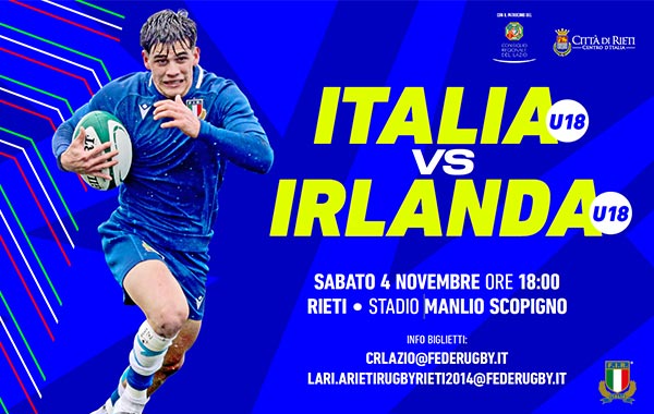 Il 4 novembre alle ore 18:00, allo Stadio “Manlio Scopigno” di Rieti, scenderanno in campo i ragazzi italiani e irlandesi delle Nazionali Under 18 per dare spettacolo. L’ADS Arieti Rugby Rieti 2014, destinerà parte del ricavato a progetti sociali di inclusione sportiva.